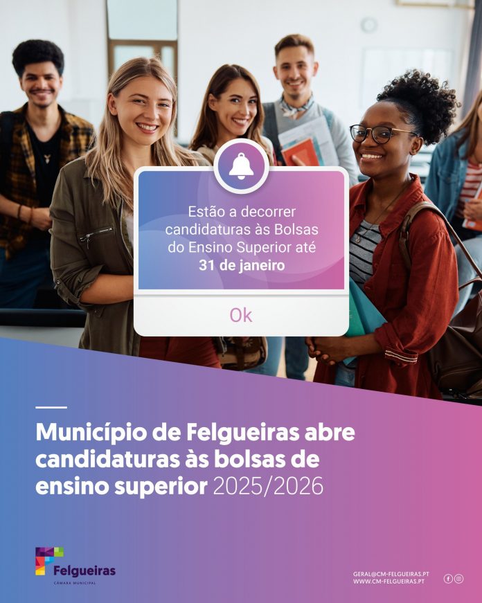 O Município de Felgueiras alerta que o prazo para apresentação de candidaturas às Bolsas de Estudo do Ensino Superior, relativas ao ano letivo 2025/2026, termina no próximo dia 31 de janeiro. O processo, que teve início a 1 de janeiro, decorre exclusivamente online, através da plataforma SIGA, sendo obrigatória a submissão digital das candidaturas.